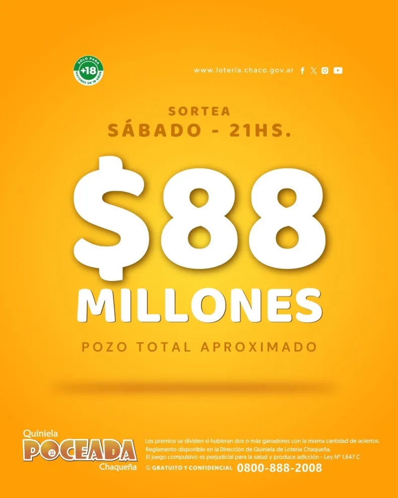 Como es habitual, este sábado a las 21 se llevará adelante un nuevo sorteo de la Quiniela Poceada de Lotería Chaqueña. El pozo aproximado en juego es de $88.748.176,05.