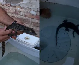 Mide 30 centímetros. Rescataron una cría de Yacaré Overo que estaba dentro de un lavarropas