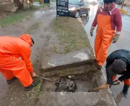 Los trabajadores municipales trabajaron en la intersección de la Avenida Lavalle y Andreani para evitar que se inunde en días de lluvia.