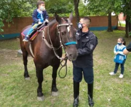 Para celebrar el Día de la Tradición, un jinete policial sorprendió a niños de un jardín de Fontana