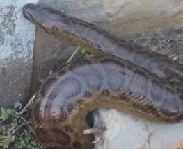 Mide 1.50 metros de altura. Hallan una anaconda amarilla en una cañería en Fontana y la devuelven a su hábitat